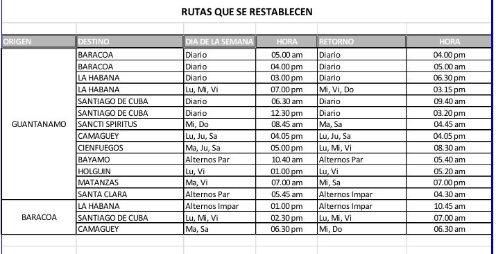 استُؤنفت خدمة الحافلات اليومية من غوانتانامو إلى باراكوا، وسانتياغو دي كوبا، وهافانا. تنطلق الرحلات الساعة 5:00 صباحًا، و6:30 صباحًا، و3:00 مساءً على التوالي. كما أُعيدت الرحلات إلى كاماغوي، وسيينفويغوس، وسانكتي سبيريتوس بالتناوب. بالإضافة إلى ذلك، تُغادر رحلات إلى ماتانزاس وهولغين بمواعيد محددة.