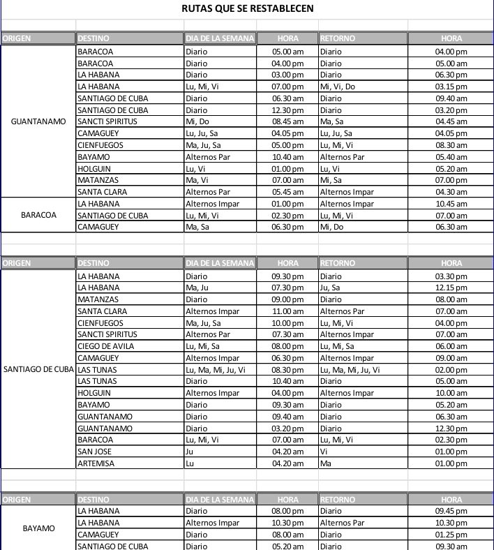 استُؤنفت الرحلات اليومية من سانتياغو دي كوبا إلى هافانا، وماتانزاس، ولاس توناس، وغوانتانامو، وبايامو. مواعيد المغادرة بين الساعة 7:30 مساءً و10:40 صباحًا، حسب الوجهة. كما استأنفت بايامو رحلاتها إلى هافانا، حيث تُغادر يوميًا الساعة 8:00 مساءً وتعود الساعة 9:45 صباحًا.