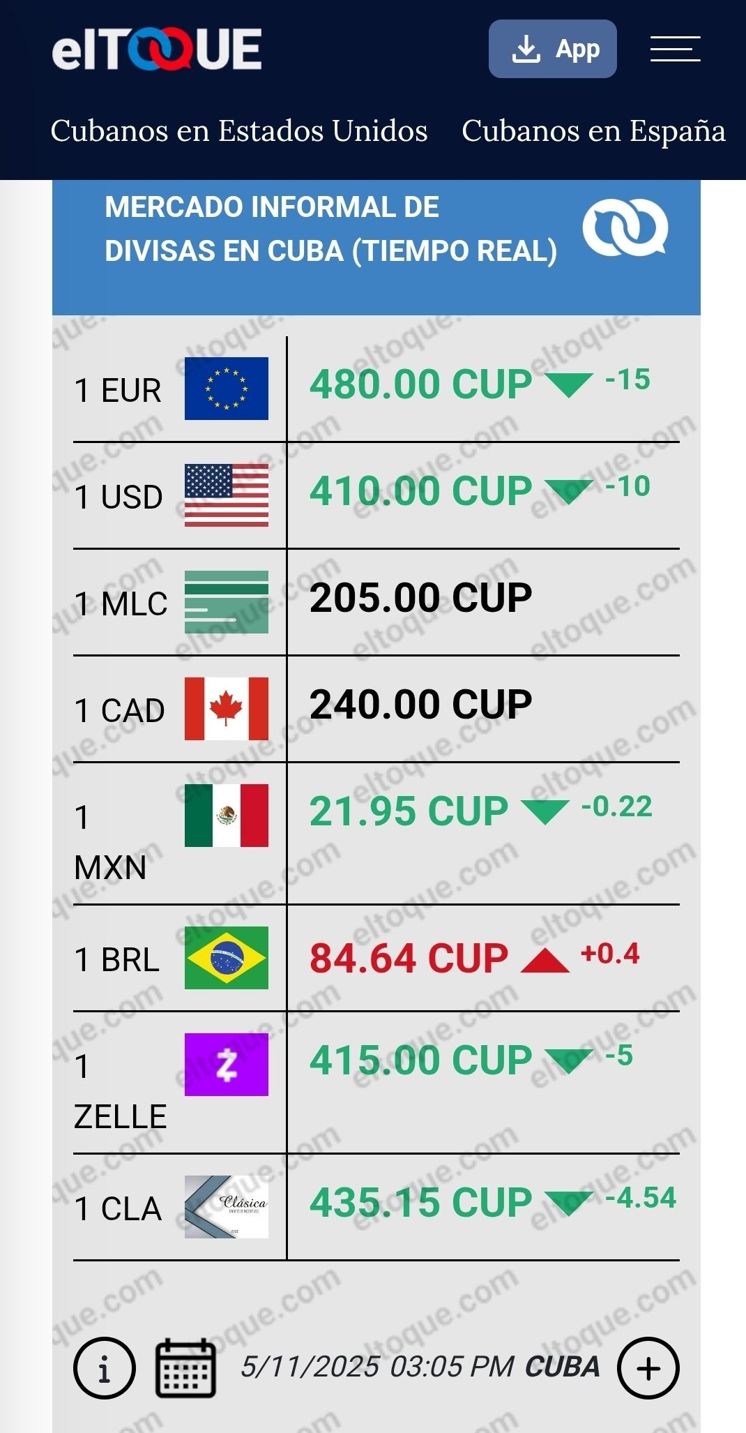 كما تراجع سعر الدولار الزيللي المرتبط بالتحويلات الإلكترونية إلى 415 CUP. في المقابل، MLC ويحافظ على سعره عند 205 CUP.